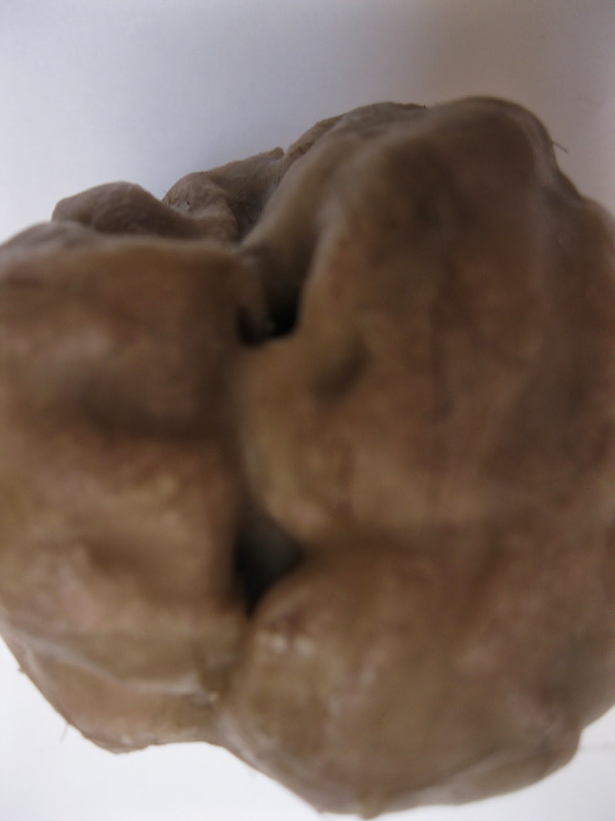 O material utilizado é tecido de algodão, cera de abelha industrializada e cabelo humano.